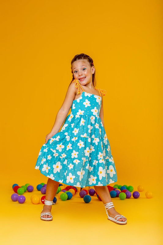 Blue Daisy Dress for Girls, Ages 2-8 – Elegant Floral Design, Comfortable, Ideal for Any Occasion